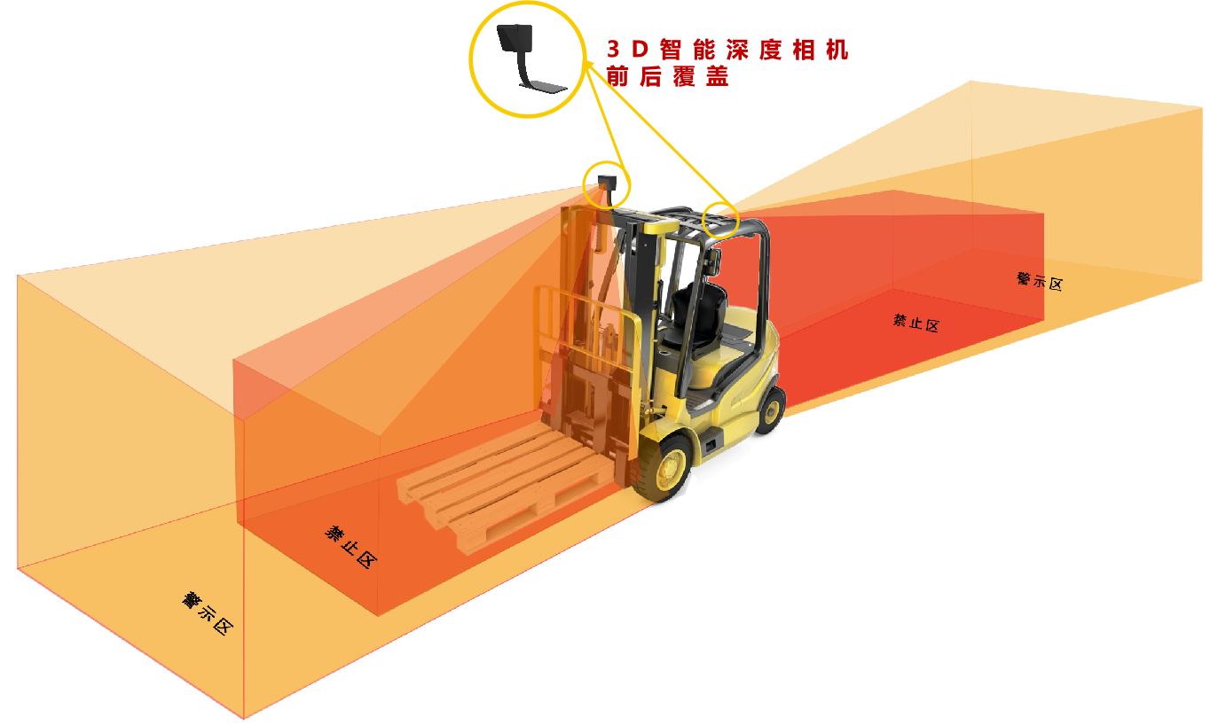 叉车安全系统采用3D机器视觉技术,可在车辆前后设定警示区和禁止区,用于可能的障碍物碰撞声光报警提示,以及可能的人身安全强制停车。